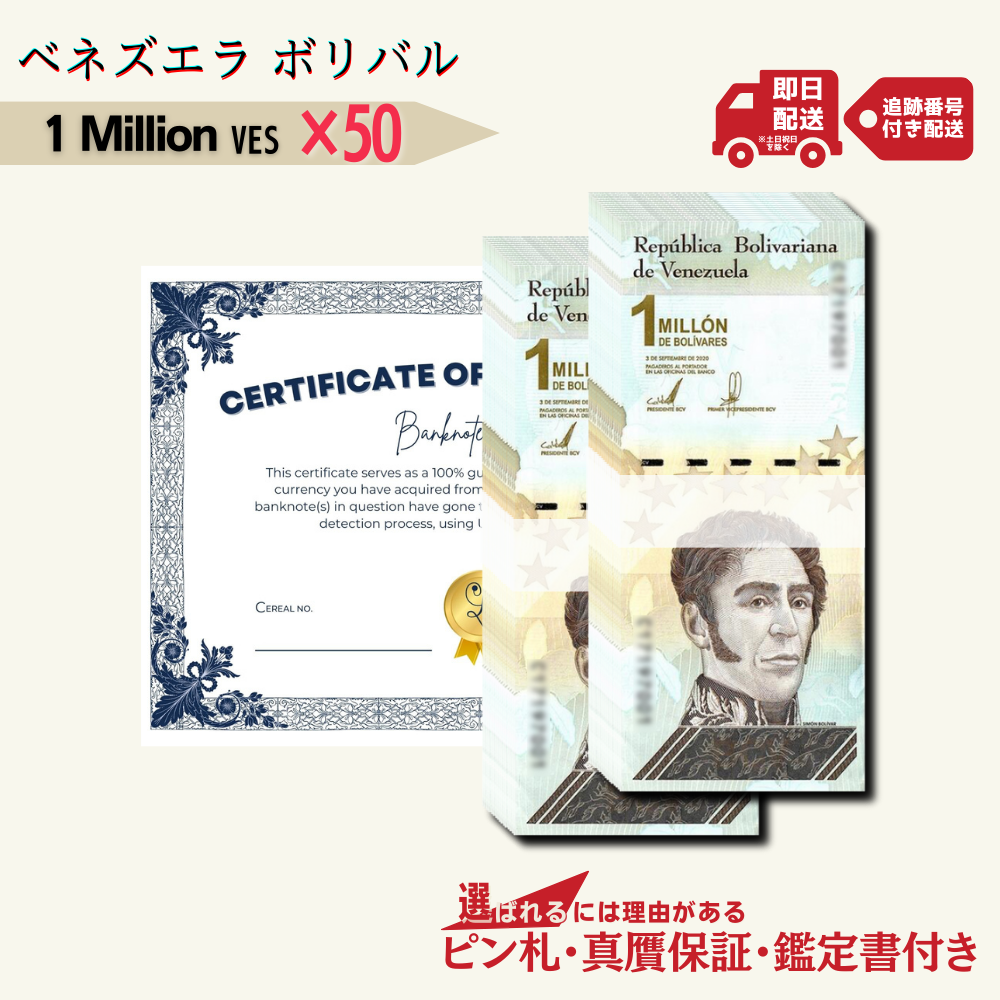 10%OFF 1ミリオン ボリバル・ソベラノ 50枚★即日発送・ピン札保証・鑑定書 1,280円相当×購入枚数の特典付き|ベネズエラ紙幣|Bolívar Soberano million|100万ボリバル|本物紙幣保証 最高額面紙幣【ラフテル公式】/V-3